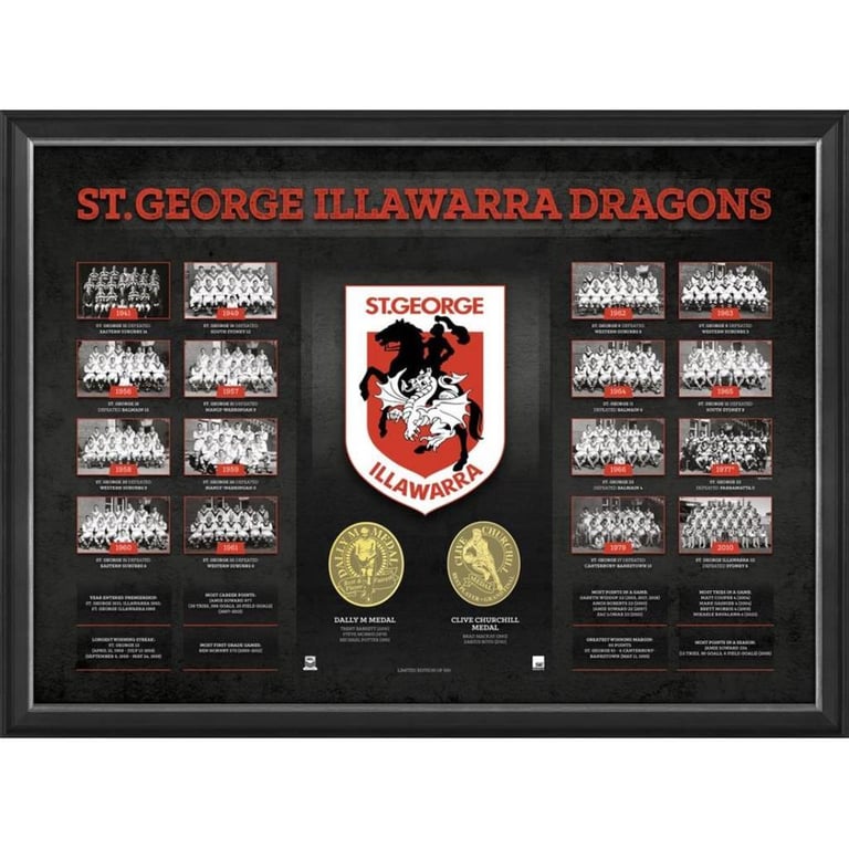 ST GEORGE ILLAWARRA DRAGONS HISTORICAL SERIES DISPLAYThis Magnificent Piece Pays Tribute To The Rich History Of The St George Illawarra Dragons, Capturing Its Premiership History In Pictorial Detail, Along With Those Recognised As Dally M Medallists And Clive Churchill Medallists. It’S The Definitive Nod To Individual And Shared Success For All Dragons Fans And Astute Collectors.Pays Tribute To The Esteemed History Of Individual And Team Success Of The St George Illawarra DragonsStunning Piece Includes A Definitive Pictorial History Of The Dragons’ Premiership Success, Along With Several Club Records And AchievementsIncludes Foiled Dally M And Clive Churchill Imagery, Along With The Names Of The Recipients Of Each DistinctionLimited To Just 500 Editions Worldwide, With Each Edition Accompanied By An Individually Numbered Certificate Of AuthenticityApproximate Framed Dimensions 750 X 550 MmCondition: Good - Refer To Images488273+333110