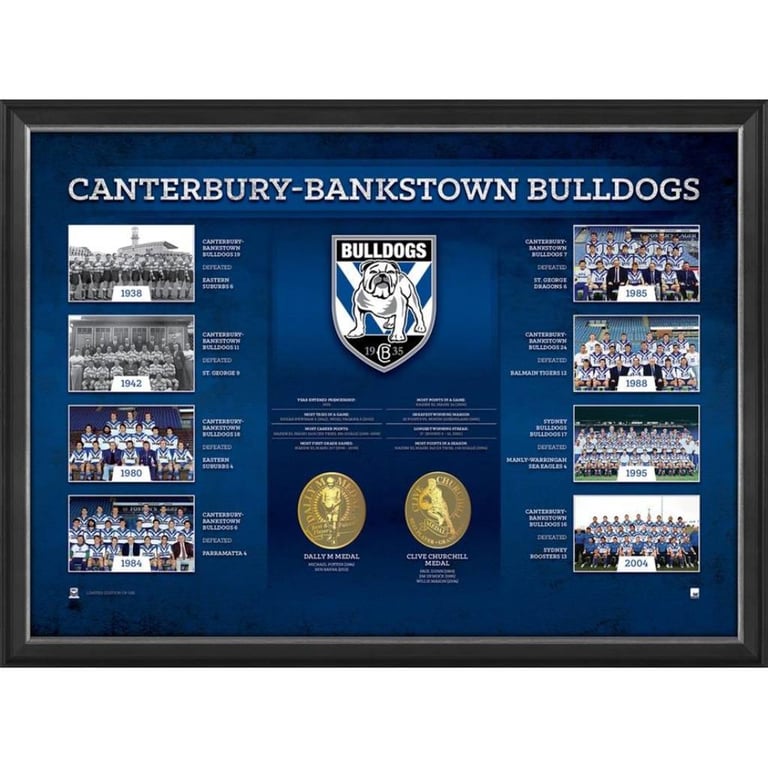 BULLDOGS HISTORICAL SERIES DISPLAYThis Magnificent Piece Pays Tribute To The Rich History Of The Canterbury Bankstown-Bulldogs, Capturing Its Premiership History In Pictorial Detail, Along With Those Recognised As Dally M Medallists And Clive Churchill Medallists. It’S The Definitive Nod To Individual And Shared Success For All Bulldogs Fans And Astute Collectors.Pays Tribute To The Esteemed History Of Individual And Team Success Of The Canterbury Bankstown-BulldogsStunning Piece Includes A Definitive Pictorial History Of The Bulldogs’ Premiership Success, Along With Several Club Records And AchievementsIncludes Foiled Dally M And Clive Churchill Imagery, Along With The Names Of The Recipients Of Each DistinctionLimited To Just 500 Editions Worldwide, With Each Edition Accompanied By An Individually Numbered Certificate Of AuthenticityApproximate Framed Dimensions 750 X 550 MmCondition: Good - Refer To Images488273+333111
