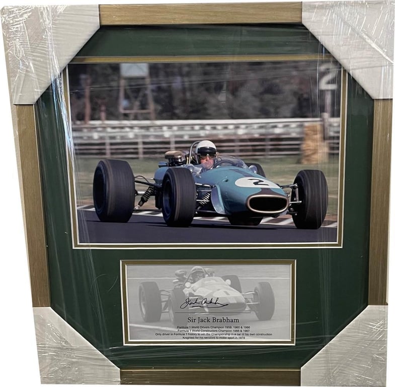 SIGNED SIR JACK BRABHAM CARD FRAMED. COMES WITH COA AND PHOTOPROOF
