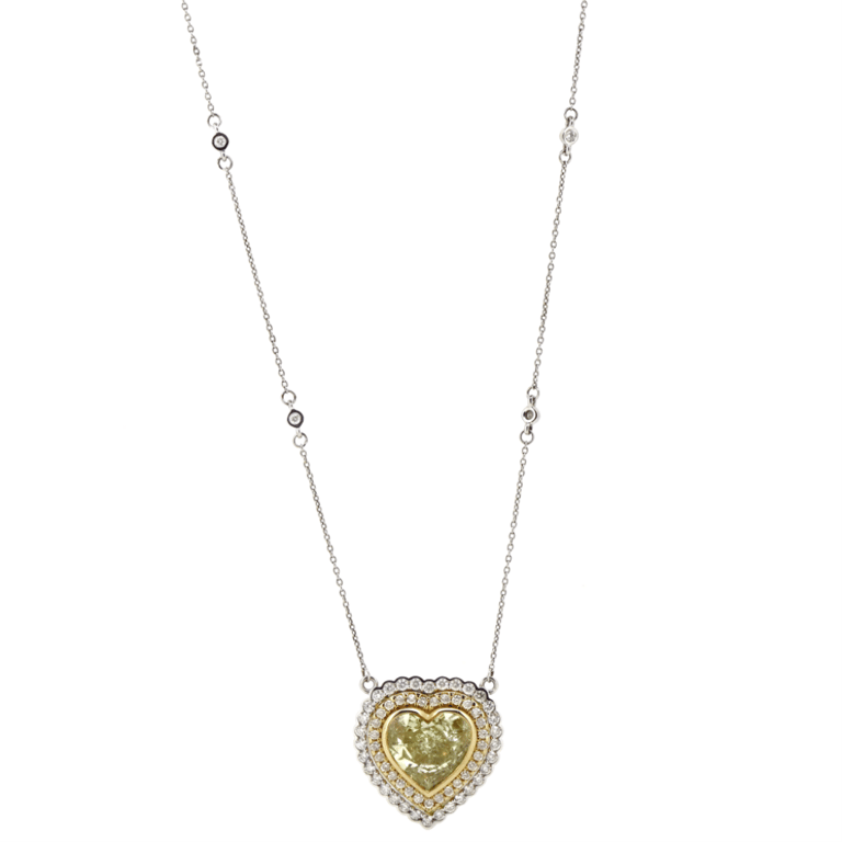 The Pendant Features, One Heart Modified Brilliant Cut, Diamond (3.18Ct, Y-Z Colour, P2 Clarity), Bezel Set In Yellow Gold. Surrounding The Centre In A Double Halo Are, 67 Round Brilliant Cut, Diamonds (0.80Ct Tdw, H-K Colour, P2+ Clarity), Bead Set In White Gold. The Necklace Has A Fine Cable Link, With Lobster Clasp. Necklace Length Is 45Cm.