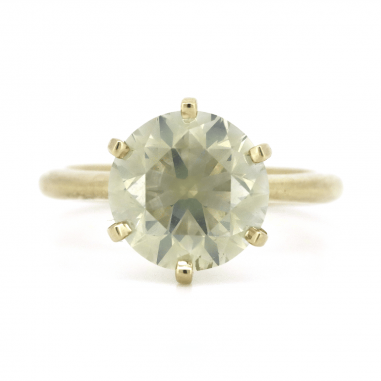 The Centre Features, One Round Brilliant Cut, Greenish-Yellow, Diamond (5.30Ct, I1 Clarity), 6 Claw Set. Ring Size O.