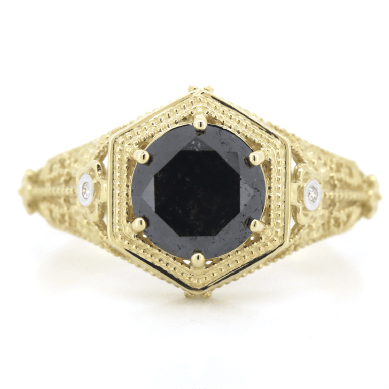The Centre Features, One Round Brilliant Cut, Black, Diamond (2.16Ct, Opaque), 6 Claw Set. Decorating The Shoulders Are, 2 Round Brilliant Cut, Diamonds (0.01Ct Tdw, H-Colour, Si Clarity), Bezel Set. The Band Is Decorated With Elaborate Floral Designs. Ring Size N.