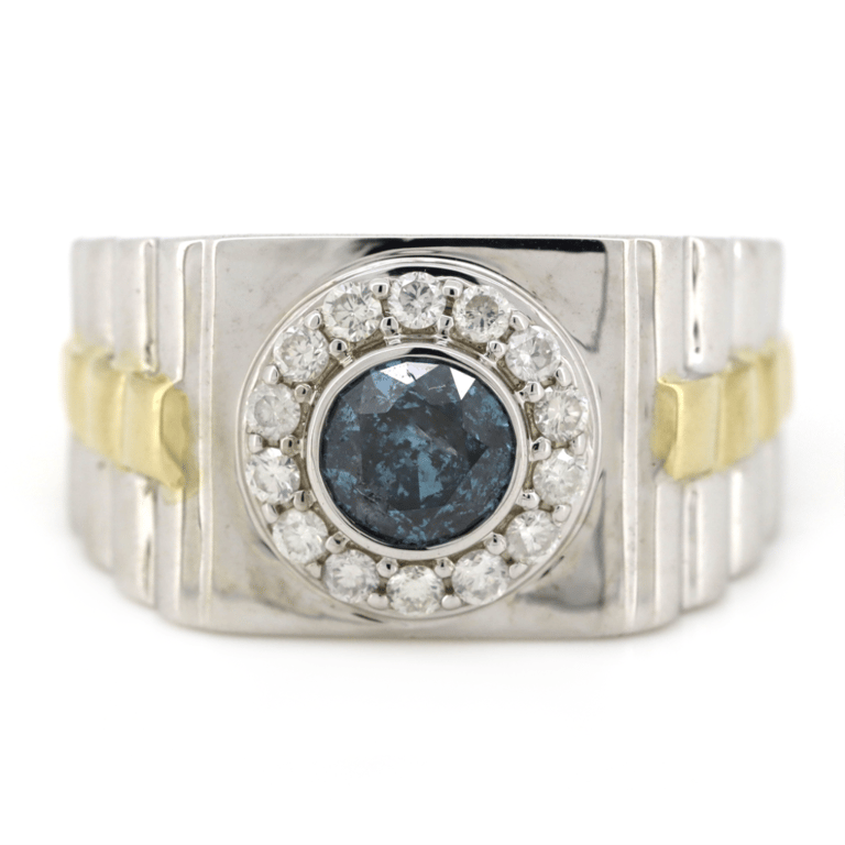 14K WHITE GOLD, BLUE DIAMOND AND DIAMOND, GENTS RING. The Centre Features, One Round Brilliant Cut, Teal Blue, Diamond (1.02Ct, Hpht Enhanced, Clarity P2), Bezel Set. Surrounding The Centre In A Halo Are, 14 Round Brilliant Cut, Diamonds (0.35Ct Tdw, H-K Colour, P2+ Clarity), Bead Set. The Ring Has Been 14K Yellow Gold Rhodium Plated, To Achieve A Two-Tone Effect. Ring Size R 1/2. Valuations Provided by an Independent Third-Party Professional Not Directly Associated With Lloyds Auctions at AUD $$19,000.00This valuation has been conducted by an independent third-party professional. The valuation amount is an assessment by the issuing valuer and does not reflect the auction value of the item. Any inquiries regarding the valuation should be directed to the issuing valuer (refer to contact details on the certificate), as Lloyds Auctions has no affiliation or influence over the valuation, the valuer, or the stated amount. Condition: Good - Refer Images 0645843+7099