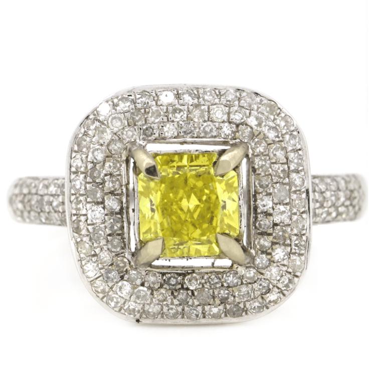 The Centre Features, One Princess Cut, Fancy Vivid Yellow, Diamond (1.05Ct, Colour Treated, Vvs2 Clarity), 4 Claw Set. Surrounding The Centre In A Cluster Halo Design And Decorating The Band Are, 68 Round Brilliant Cut, Diamonds (0.34Ct Tdw, G-H Colour, Si1-P1 Clarity), Pave Set. Auscert Diamond Report: 2023D24207. Ring Size O.