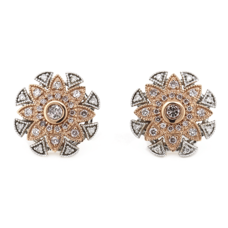 The Centres Feature 2 Round Brilliant Cut, Fancy Light Pink, Diamonds (0.14Ct Tdw, Clarity), Bezel Set In Rose Gold. Encompassing The Centre Are, 42 Round Brilliant Cut, Fancy Light Pink Diamonds (0.28Ct Tdw, Clarity), Bead Set In Rose Gold With Millegrain Detail. Decorating The Outer Design Are 16 Round Brilliant Cut Diamonds (0.08Ct Tdw, Colour, Clarity), Bead Set In White Gold With Millegrain Detail. The Earrings Feature Post Backs, With 14K White Gold Butterfly Clasps.