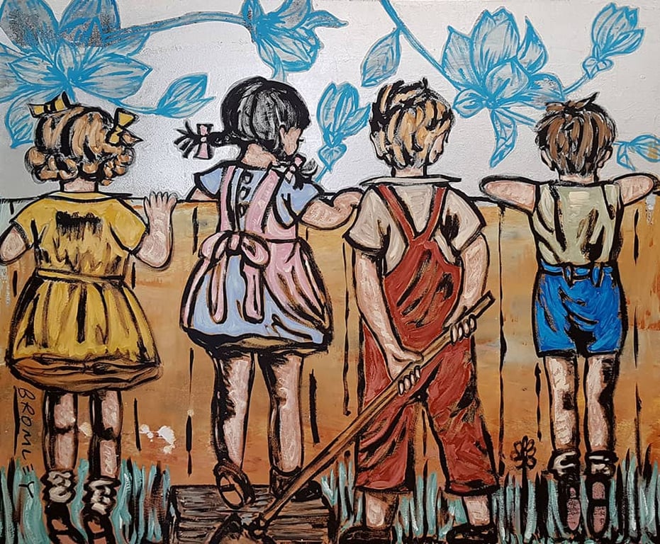 DAVID BROMLEY (1960- ) Original Acrylic And Silver Leaf Title: Over The Fence Item Size: Height: 150.5cm, Width: 180cm Signature Details: Signed Lower Left Unframed Condition: Good - Refer To Images 587678+1