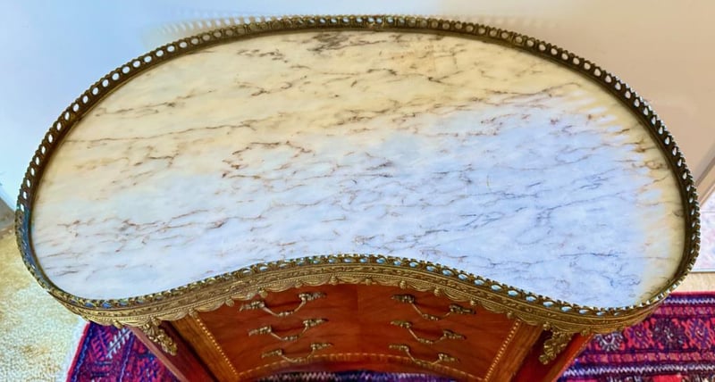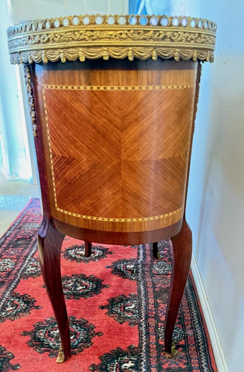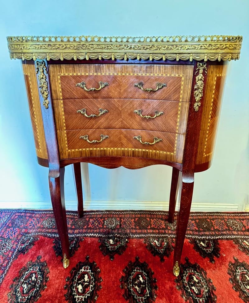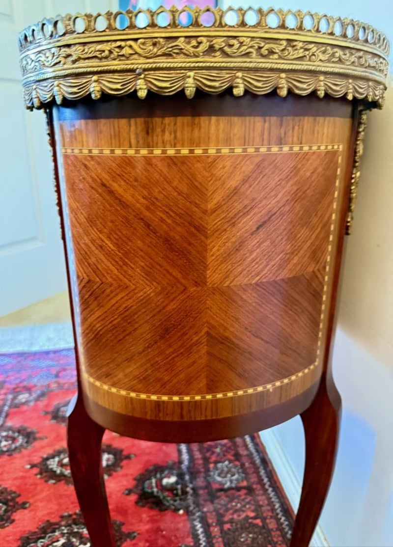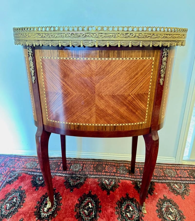 Features Quality Marquetry In Mahogany, Kingwood And Satin Wood With Brass Mounts And A Cararra Marble Top