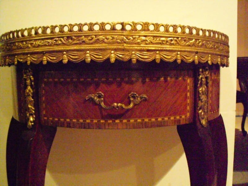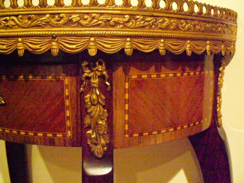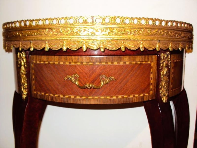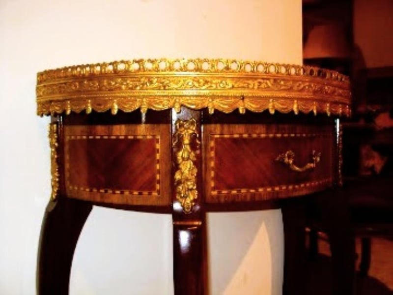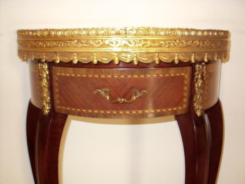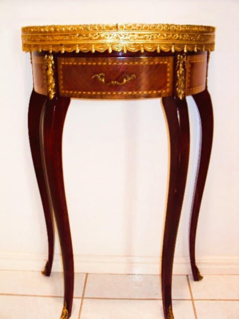 20TH CENTURY FRENCH HALF MOON CONSOLE TABLE IN THE STYLE OF LOUIS IV Mahogany, Kingwood And Satin Wood Marquetry, White Marble Top And All Over Brass Mounts And Filigree Embellishments Dimensions: 72Cm H X 32Cm W X 50Cm L Condition: Good - Refer To Images 586267+11