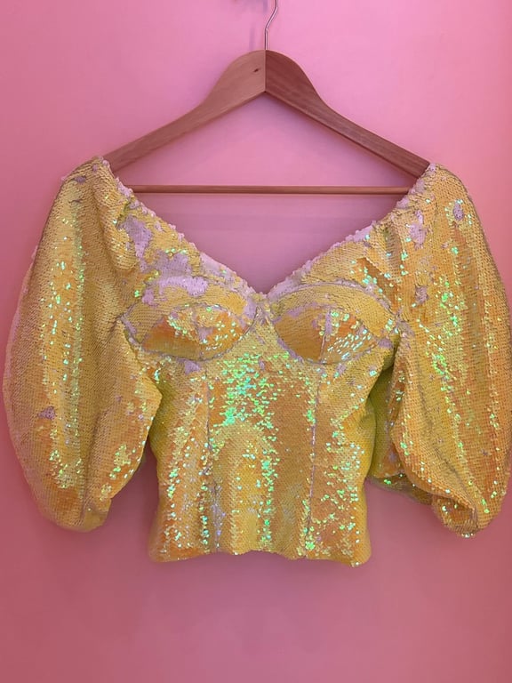 RRP $290 Silvia Astore Flip Sequin Puff Sleeve Bustier SILVIA ASTORE Yellow face, white back flip sequin Sweetheart bust line Fitted torso Exposed centreback zipper 100% Polyester