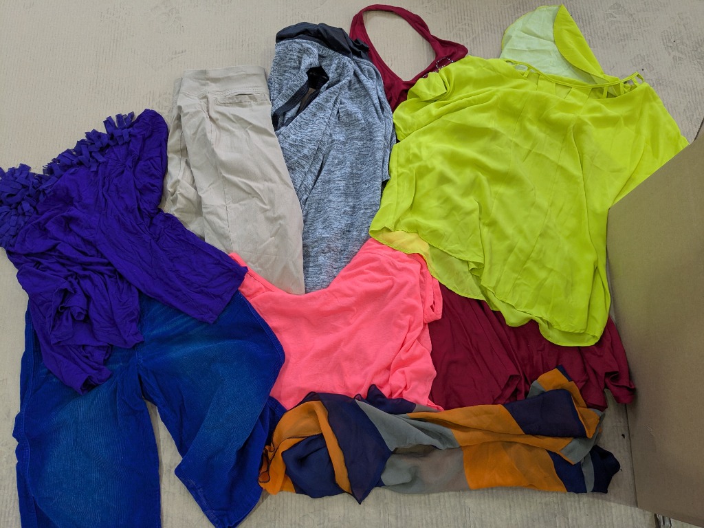 Clothing, box comes with an assortment of random men's and women's clothing - box contains 30 items, containing random assortment of tees, skirts, dresses shorts, etc Sold as lot