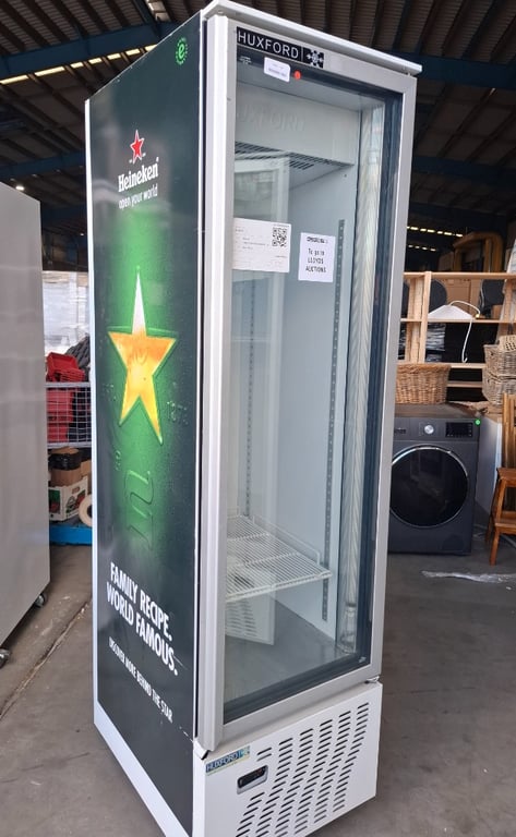 Glass Door fridgeMake: HUXFORDModel: FM15 PlusSerial: HA180173Details: Heineken Logo, Shelf load 55 KG, one shelf , Caster WheelsDimensions: 200cm H x 55cm W x 71cm D NOTE: MINOR CLEANING REQUIRED, Minor Marks and Scratches