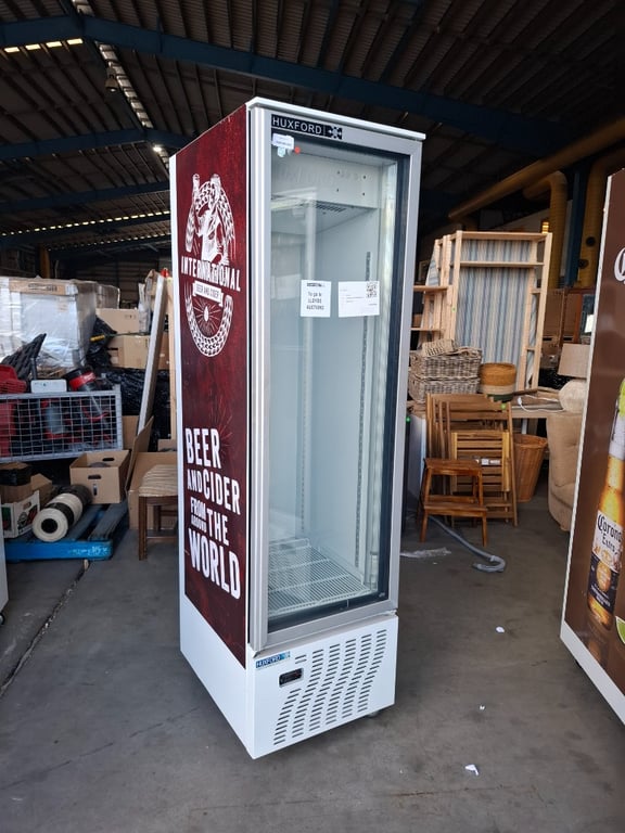 Glass Door fridgeMake: HUXFORDModel: FM15 PlusSerial: HA180258Details: International Beer and Cider Logo, Shelf load 55 KG, one shelf , Caster WheelsDimensions: 200cm H x 55cm W x 71cm D NOTE: MINOR CLEANING REQUIRED, Minor Marks and Scratches