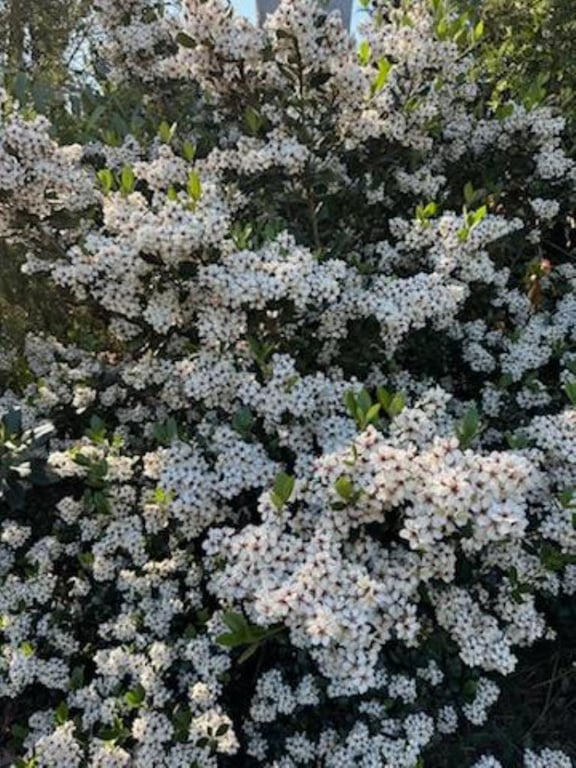 Bushy hedge grown for its glossy hardy leaf, with a mass array of white pearl flower