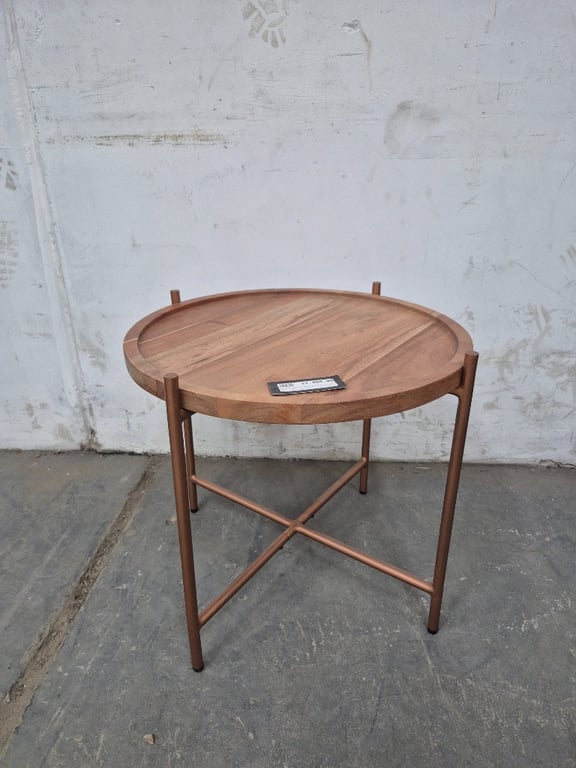 RRP: $1805, Esila Acacia Wood Table, Brass Frame, Acacia Timber Finish.Dimensions Large.. H46cm x W53.5cm x D53.5