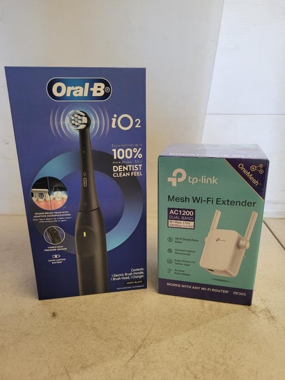 1x ORAL-B IO2 night black electric toothbrush RRP$ 99, NEW factory sealed in box, TP-LINK mesh wifi extender AC1200 dual band RE305 NEW factory sealed in box