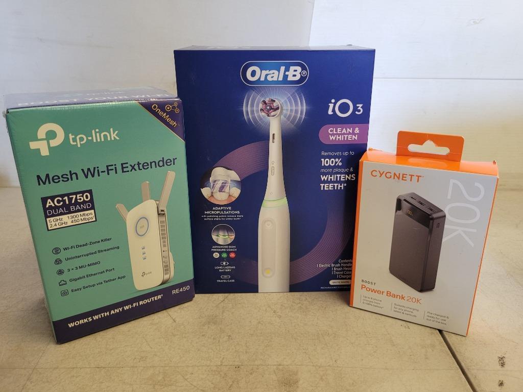 1x ORAL-B IO3 ice blue electric toothbrush RRP$ 99, NEW factory sealed in box, 1xTP-LINK mesh wifi extender AC1750 dual band RE450 NEW factory sealed in box, 1x CYGNETT power bank 20k boost NEW factory sealed in box