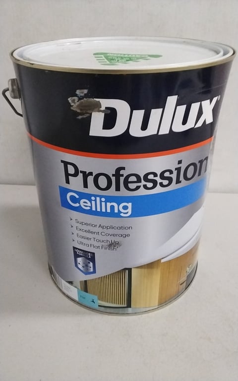 Paint, Dulux Professionals Ceiling PaintColour, Flat White10 litre tinNote dented tinBID PER LITRE MUST TAKE 10 LITRE TIN,