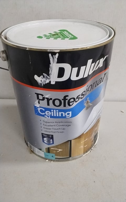 Paint, Dulux Professionals Ceiling PaintColour, Flat White10 litre tinNote dented tinBID PER LITRE MUST TAKE 10 LITRE TIN,