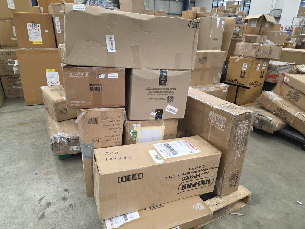 Pallet lot including mystery boxes some items included are a high chair, ride on cars, flat packs