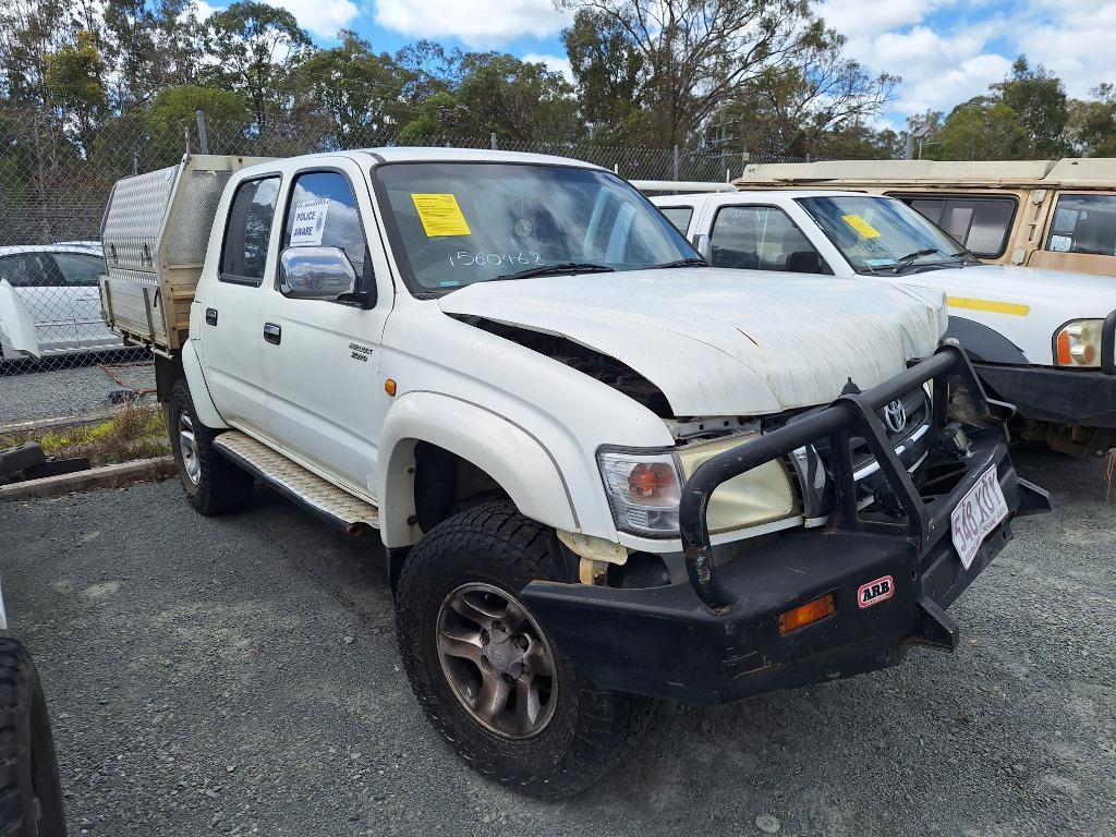 2003 Toyota Hilux Year: 2003Make: Toyota Model: Hilux Body: Dual Cab VIN: JTFDV696100013733Engine: 3.0L Turbo Diesel Odometer Indicated: 366,908KmEngine No: 1KZ1409653Transmission: 5-Speed Manual Colour: WhiteDescription: Front End Damage Kings Spotlights, Side Mounted Tool BoxAll vehicles in this sale are sold with no keys (unless stated otherwise), as is, where is, with no warranty. Any contents as shown in photos may remain with the asset. No mechanical checks or assumptions have been made, therefore we recommend careful consideration prior to bidding.Online Viewing Only, PAYMENT IS DUE 24 HOURS AFTER THE AUCTION CLOSESCollections to occur over 3 days on Wed 5th to Fri 7th of November between 7am to 3.30pm.This Vehicle is unwarrantedPotential of unknown dangerous items (e.g., broken glass, syringes, etc).Persons who enter the vehicle do so at their own risk due to potential presence of unknown items.For all Enquiries, Please Contact Jamie directly on 0486 045 295 or alternatively [email protected]