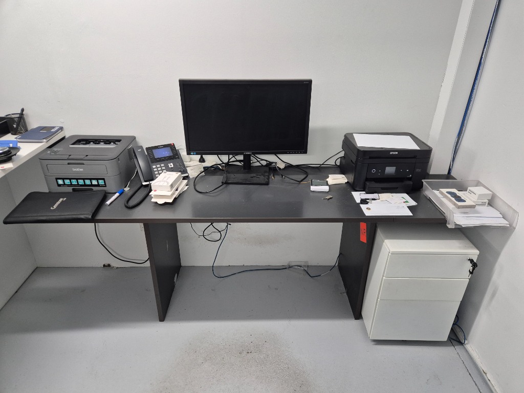 Office Essentials & More- Samsung S27E450 Monitor- 2x Printers, Brother HL-L2305W & Epson WF-2860- Desk, Brown- Storage CabnetNote: Items UntestedSOLD AS LOT