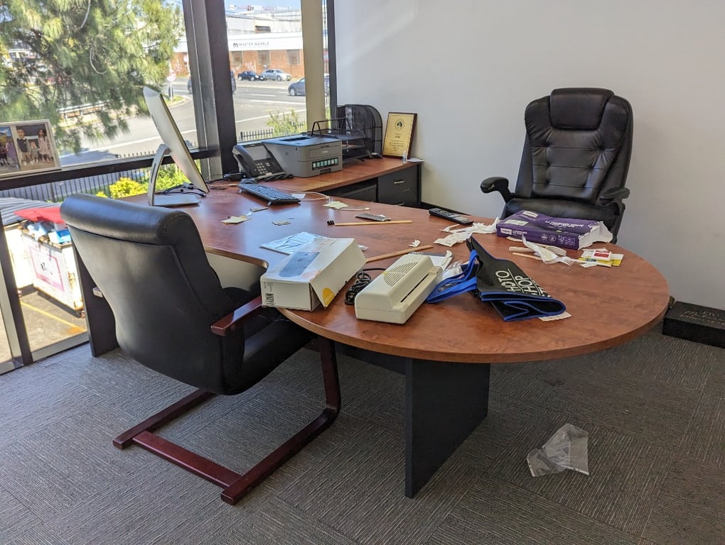 Office Setup, Bundle. Items Include:Timber Designed office Table (Items On table Included, expect HP Monitor, Keyboard, phone & Mouse)- A4 Laminator - Filing Cabinets- Brother Printer- stationary - one Swivel Office Chair & many more.... (REFER TO PHOTOS)Note: HP Monitor, Phone, Keyboard, & mouse not included.Sold as lot