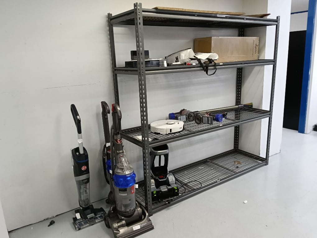 Heavy-Duty Metal Storage Racking with Mixed Contents – Upright & Robotic Vacuums, Electronics & MoreRacking dims: 187 x 190 x 54.5cmNote: Items are factory returns & are untested, sold as-is. Some dust & wear from storage, inspection recommended.