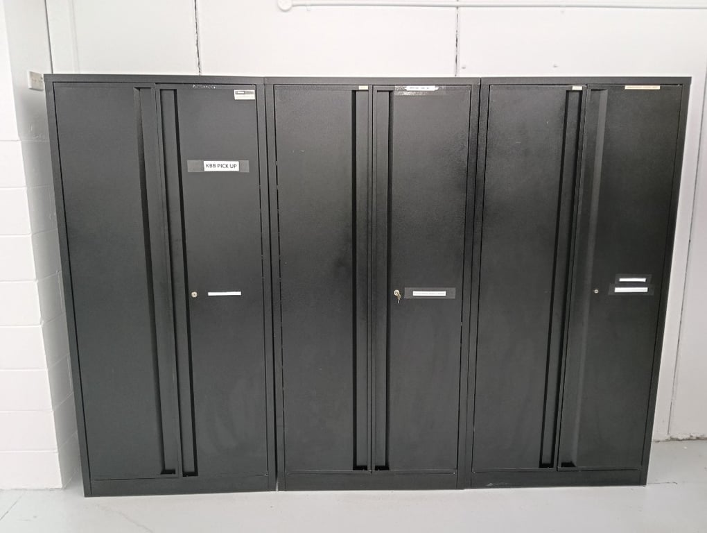 Heavy-Duty steel storage cabinets – Set of x3, adjustable internal shelving, lockable double doorsDims: 183 x 86 x 86cmSold as lot