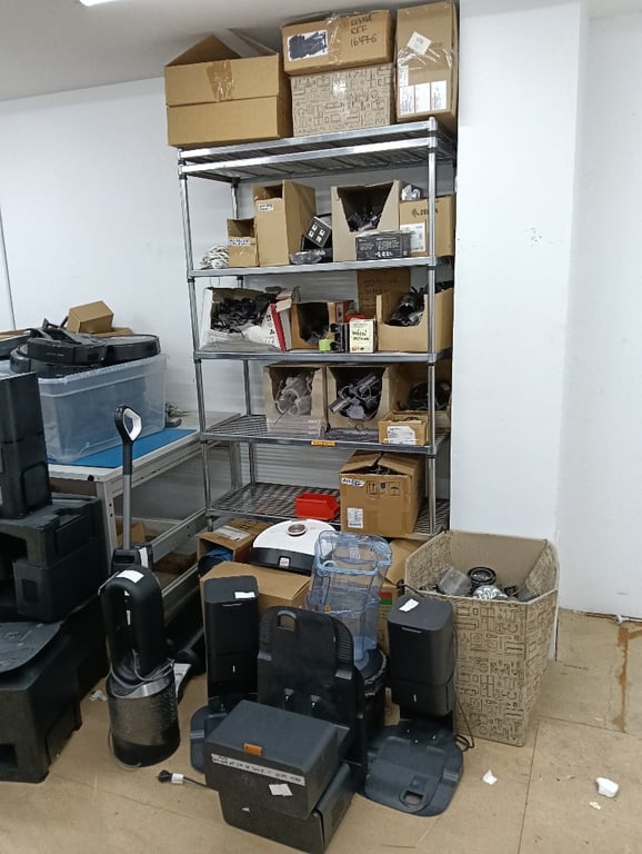 Bulk lot of robotic vacuum cleaners, docking stations & vacuum parts, factory returns for parts or repairs, mixed condition – some units appear complete, others partially disassembledAlso included:- Work table, steel base, timber top, dims: 83 x 202 x 107cm- Shelving unit, steel frame construction, adjustable shelves, 7x tiers, dims: 203 x 107 x 46cm- Black floor mats & blue vinyl protection coverNote: Sold as a bulk lot as-is, must take all. Buyers are encouraged to inspect photos carefully & bid accordingly