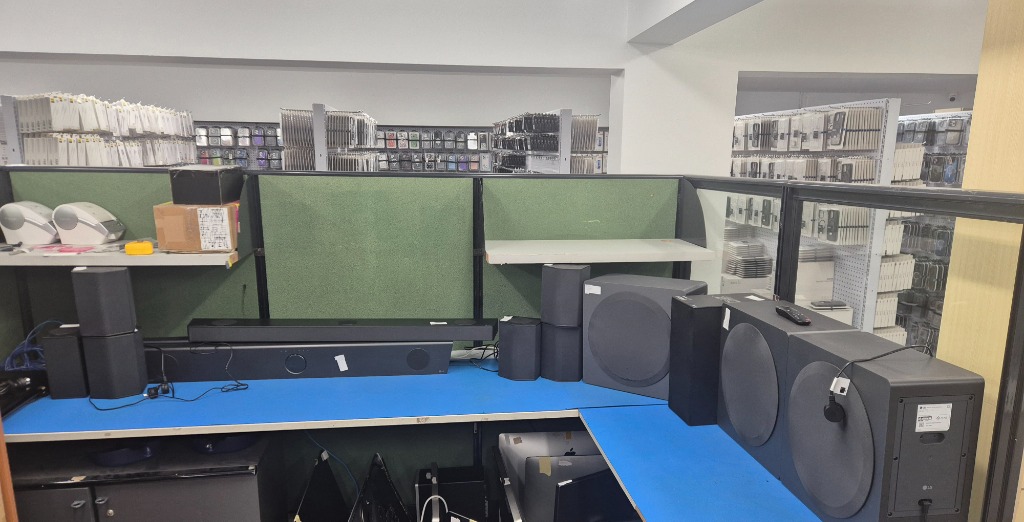 IT & Workshop- LG Surround Sound Speaker System6x tweeters, 3x Soundbar, 4x Subwoofers- 2x Brother QL-500 Recipt Printers- 2x Laptops, Dell Inspiron, s/n: 7LJ9DX2, Asus F555U - Cabinet, Black, Wood Finish- Assorted Computer Components; Harddrives, Circut Boards- L-Shaped Desk, White, Wood Finish- Cubicle Dividers Surrounding DeskNOTE: ALL ELECTRONICS UNTESTED OR MISSING PARTS INSPECTION ADVISEDSOLD AS LOT MUST TAKE ALL