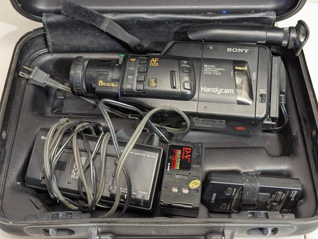Sony Handycam, video camera recorder, includes battery, charger and remote in hard carry case Note: working condition unknown
