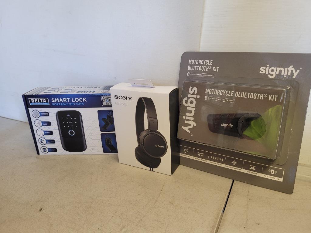 1x SIGNIGY motorcycle bluetooth kit wireless audio streaming, RRP $79, NEW factory sealed in pack, 1x SONY headphones, MDR-ZX110AP, NEW in box, 1x DELTA SMART LOCK portable key safe NEW factory sealed in box
