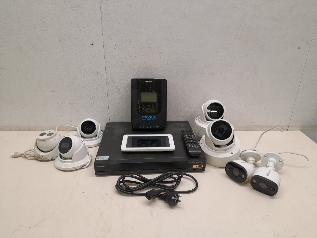 Security System Components & Solar Power EquipmentIncludes: - 7x CCTV security cameras - Rover, Renogy, 20A MPPT charg3 controller- Network video recorder (NVR), Wisenet XRN-810S, remote & power cable included - Elvex white moniterNote: Units are untested, have not checked functionalitySold as lot