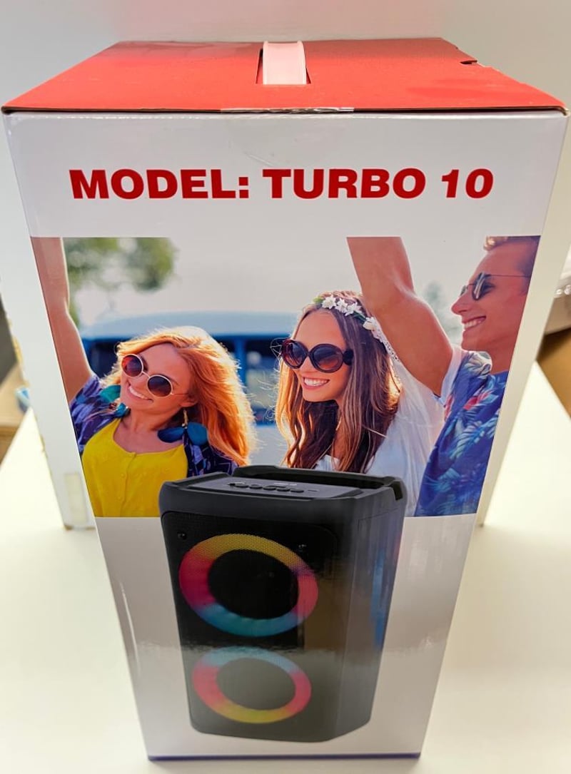 Brand New Turbo 10 Party Speaker Rechargeable, Cordless, 80W, Bluetooth, USB Ports, FM Radio, Bass Boomimh, Panel Cntrol, AUX im, 6 Light Modes