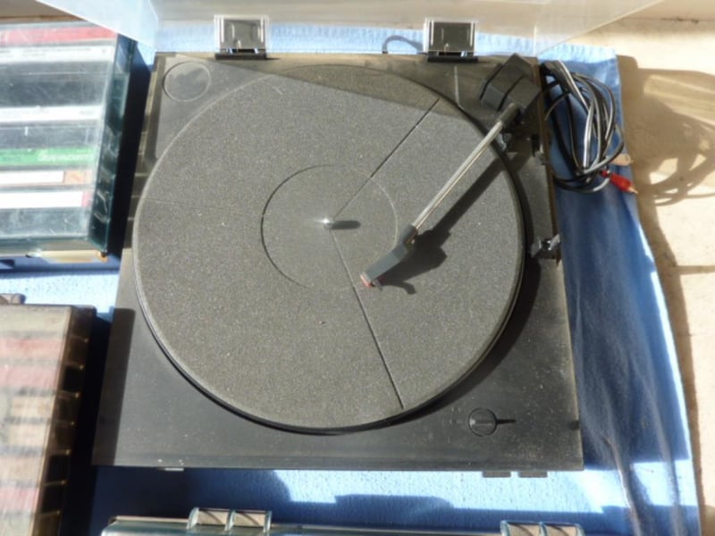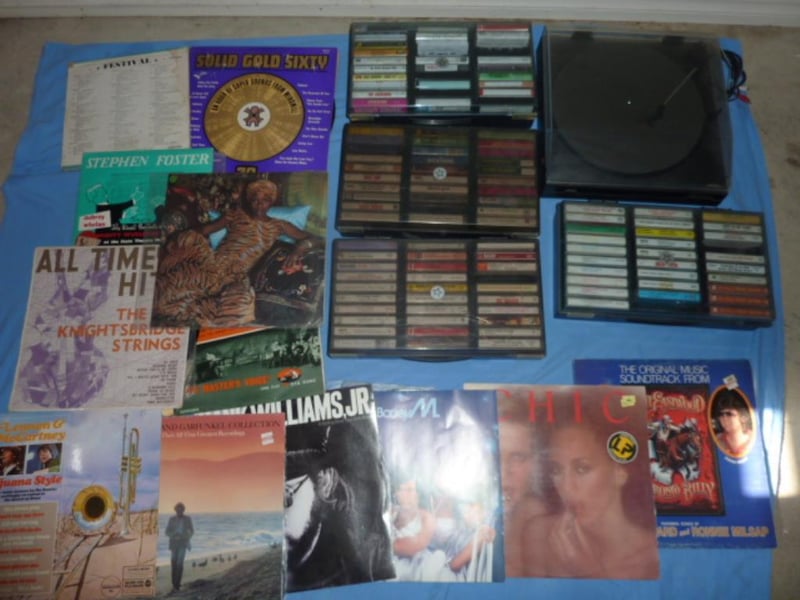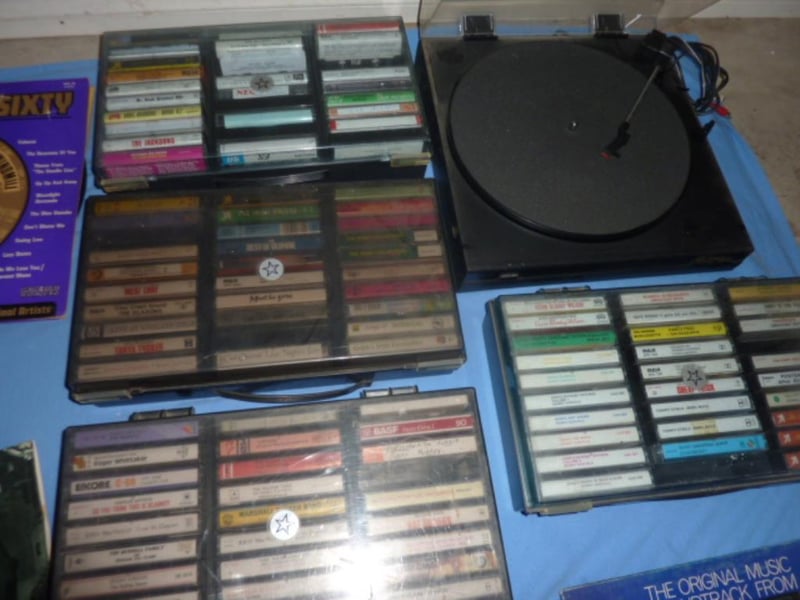 Record player Teac. Quantity of cassettes in cases. Plus records from various artists. Approx. 14 records.
