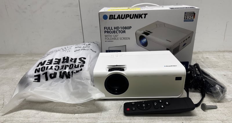 Projector, Blaupunkt projector, full HD 1080p with 120" foldable screen, model: BPS1080WBAT NOTE: condition unknown, inspection recommended