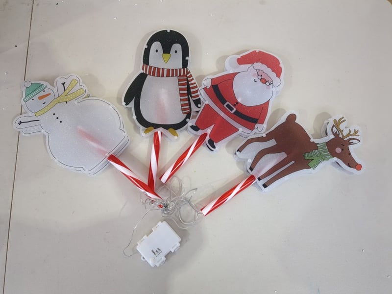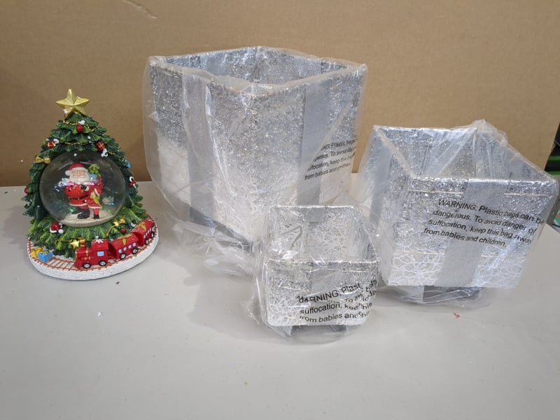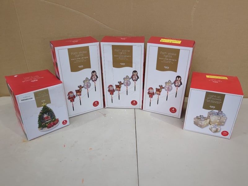 Christmas Decorations, Assorted Christmas Decorations Including Snow globe, light up gift boxes and path stake lights Sold as lot
