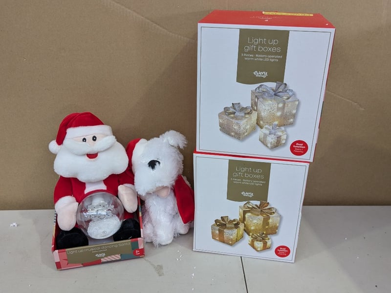 Christmas Giftwares, Including Dancing Santa, Christmas Theme puppy Plushie, and 2x Light up Git Boxes
