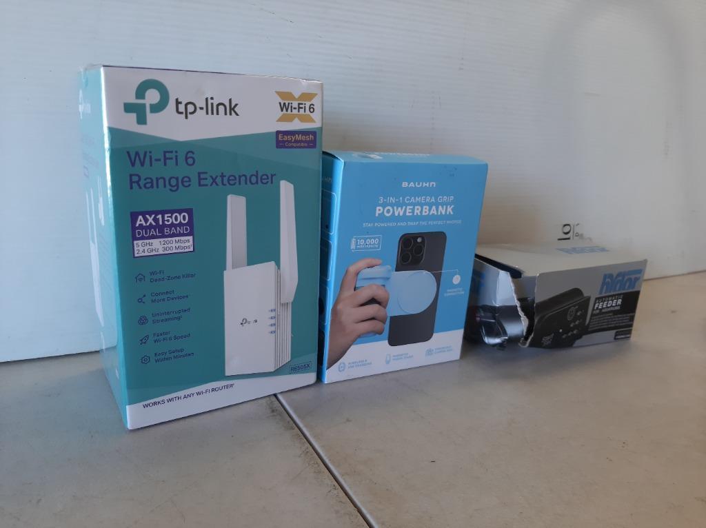 1x TP-LINK wifi 6 range extender ax1500 dual band RE505x NEW factory sealed in box, 1x HYDOR automatic feeder for aquarium 3x feedings/day NEW in boxed RRP $97.99, BAUHN 3-in-1 camera grip powerbank 10.000 mah capacity magnetic connection