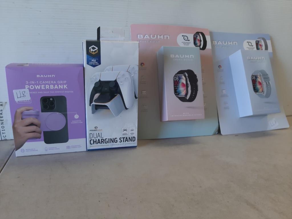 2x BAUHN smart watch touch screen with interchangeable strap, AFTWS-0425-S NEW factory sealed in boxes, 1x POWERWAVE dual charging stand convenient charging PS5 dualsense controllers NEW factory sealed in box, 1x BAUHN 3-in-1 camera grip powerbank 10000mah capacity, NEW factory sealed in box