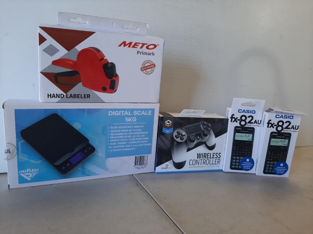 1x POWERWAVE wireless controller PS4 controller compatible, ghost, NEW factory sealed and boxed, 1 x ITALPLAST digital scale 5kg, NEW, factory sealed in box, 1x METO Primark hand labeler, NEW in box, 2 x CASIO fx-82AU plus II 2nd edition calculator,NEW factory sealed wih boxes