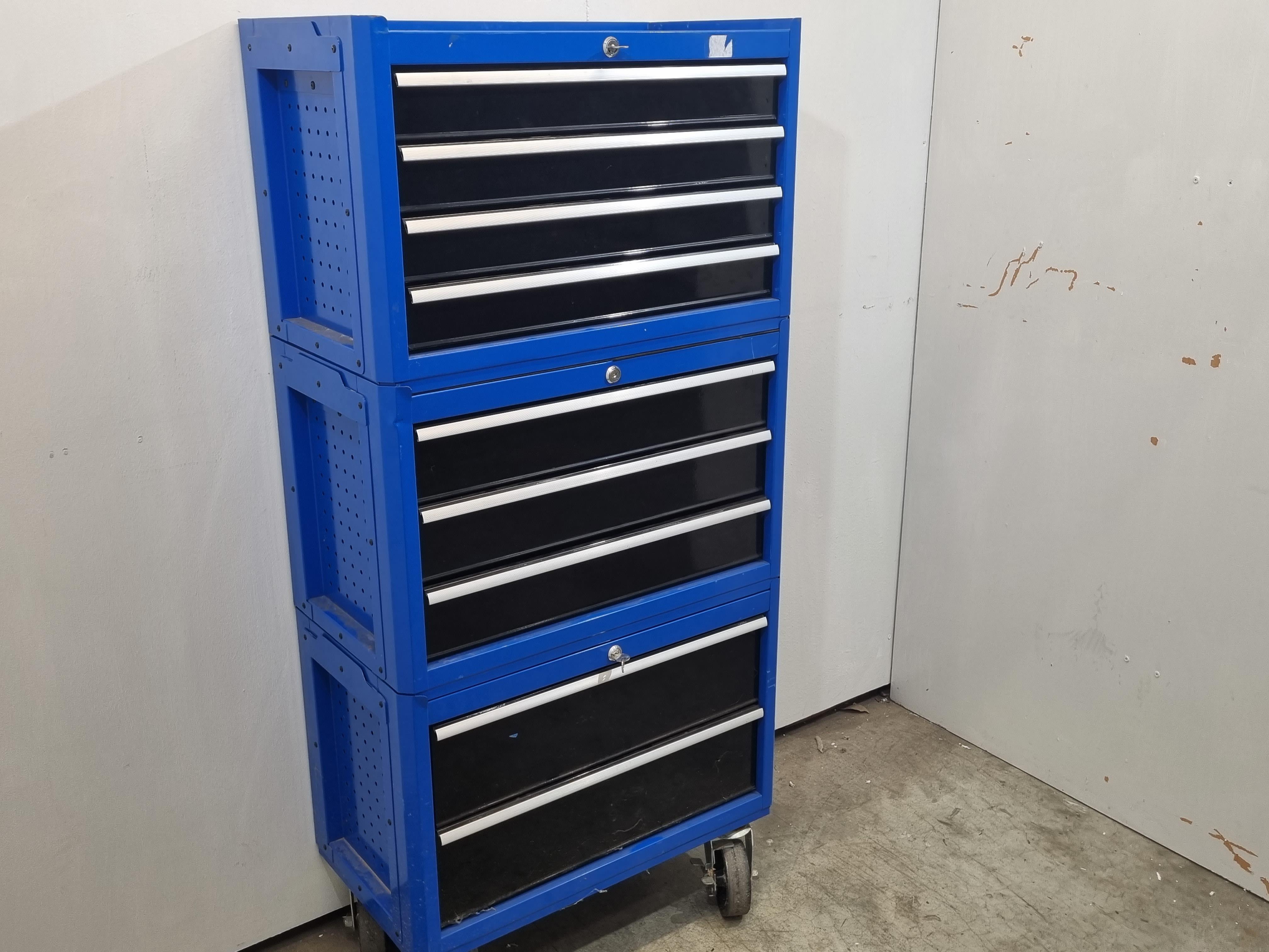 Tool chest, Metal type, blue finish, 3 tier, 9 drawers,Keys and locks included,Note 1 x key broken in lock,Approx 62cm L x 34cm D x 130cm H
