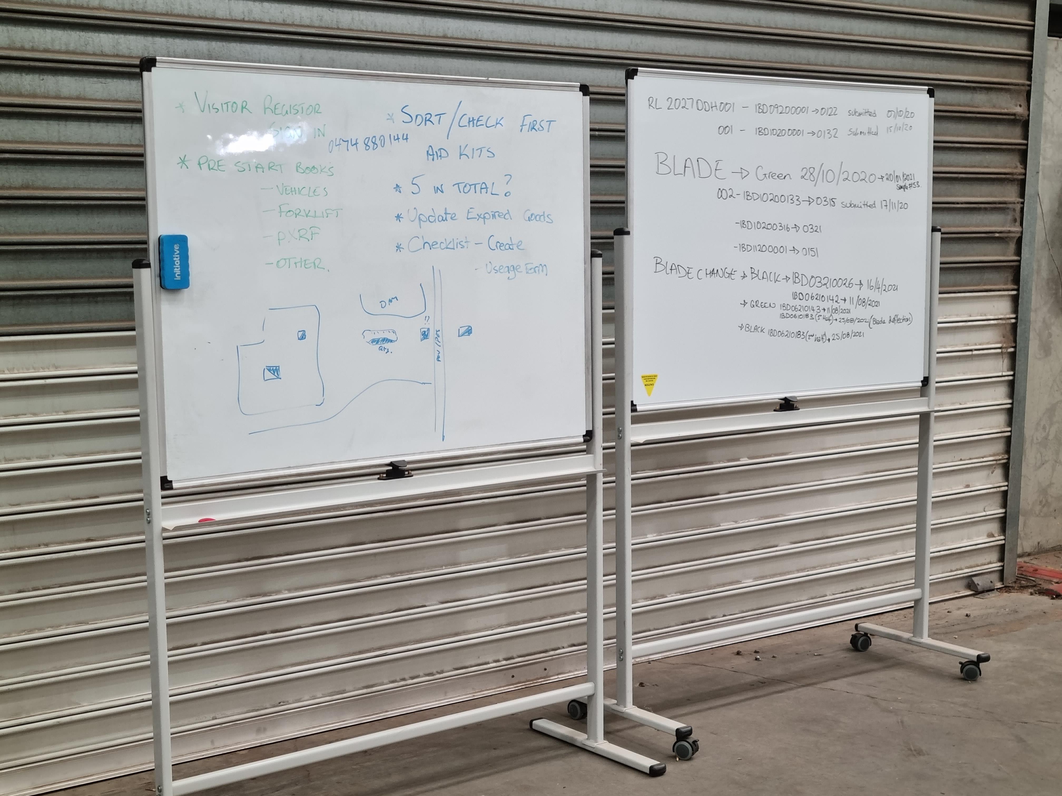 Double sided whiteboards, on frames, 1 x on casters, Approx 120cm L x 90cm W,180cm total heightQty 2,Sold as lot