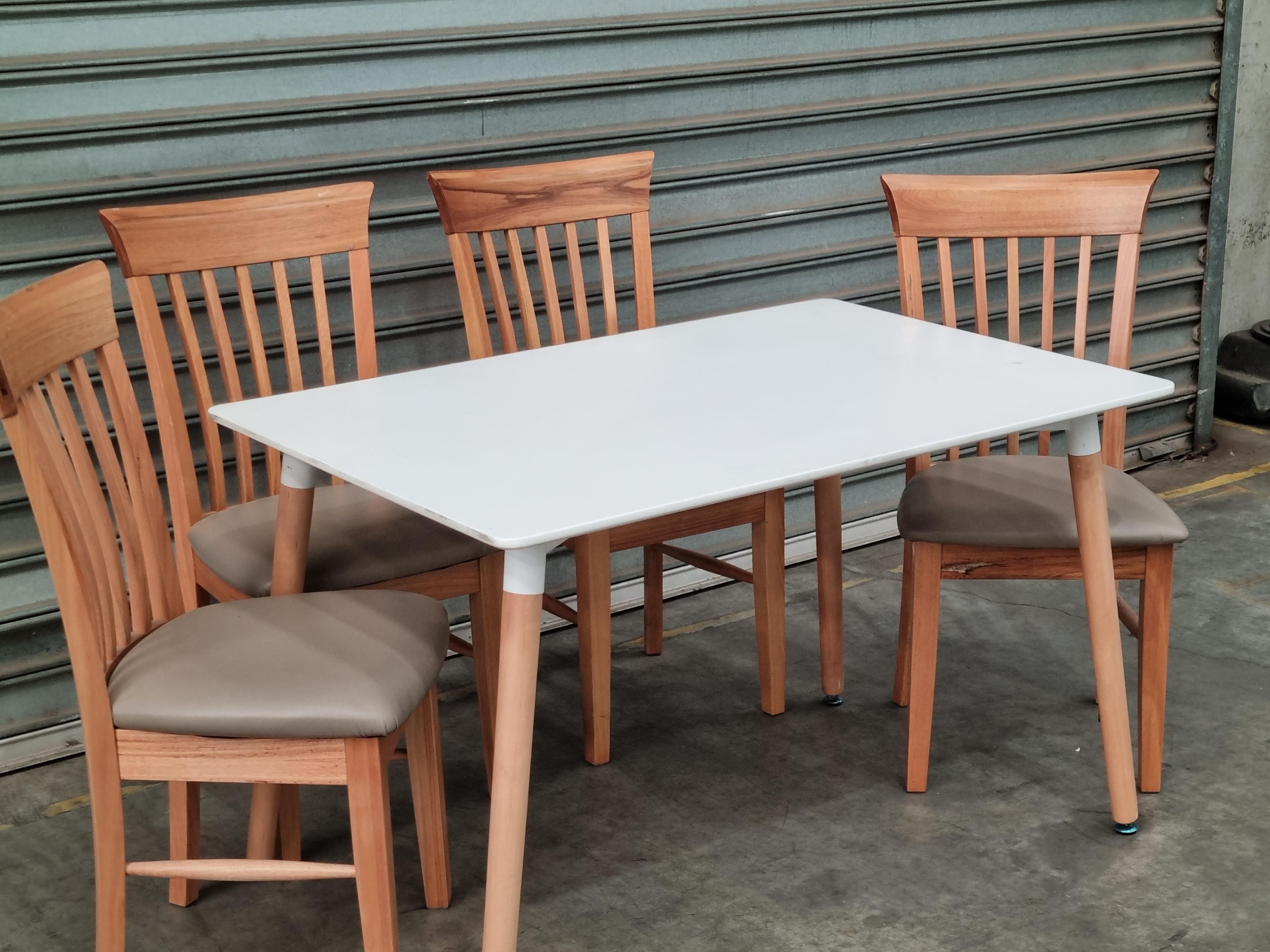 Dining table, rectangle, Timber style, white finish, Approx 120cm L x 80cm D x 75cm H, Includes dining chairs, Timber style frame, brown/beige upholstery Sold as lot