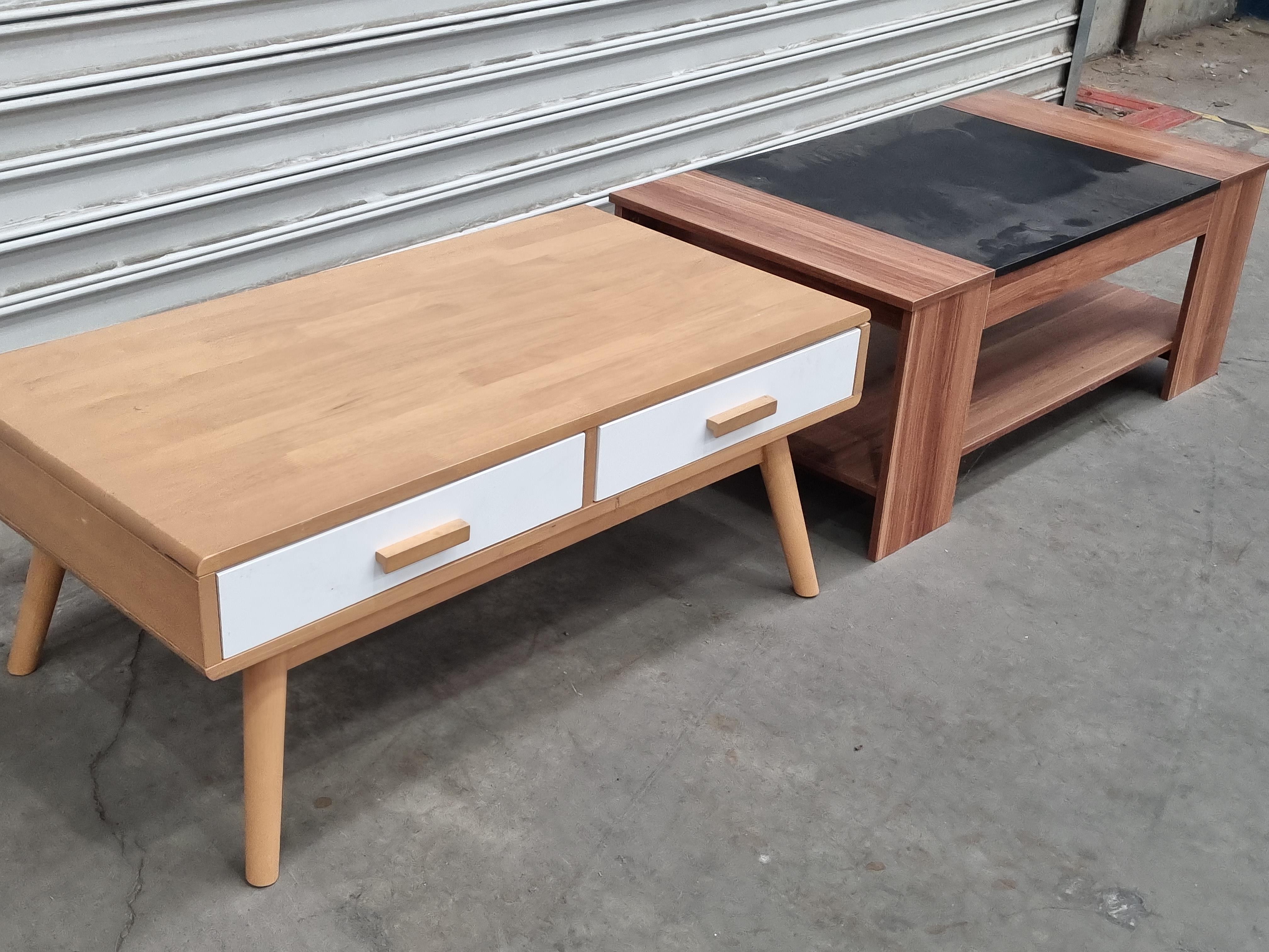 Coffee table, dark timber style, black panel, open, Approx 114cm L x 60cm D x 42cm H,Coffee table, light timber style, 2 drawers, white finish, Approx 106cm L x 56cm D x 43cm H,Qty 2,Sold as lot