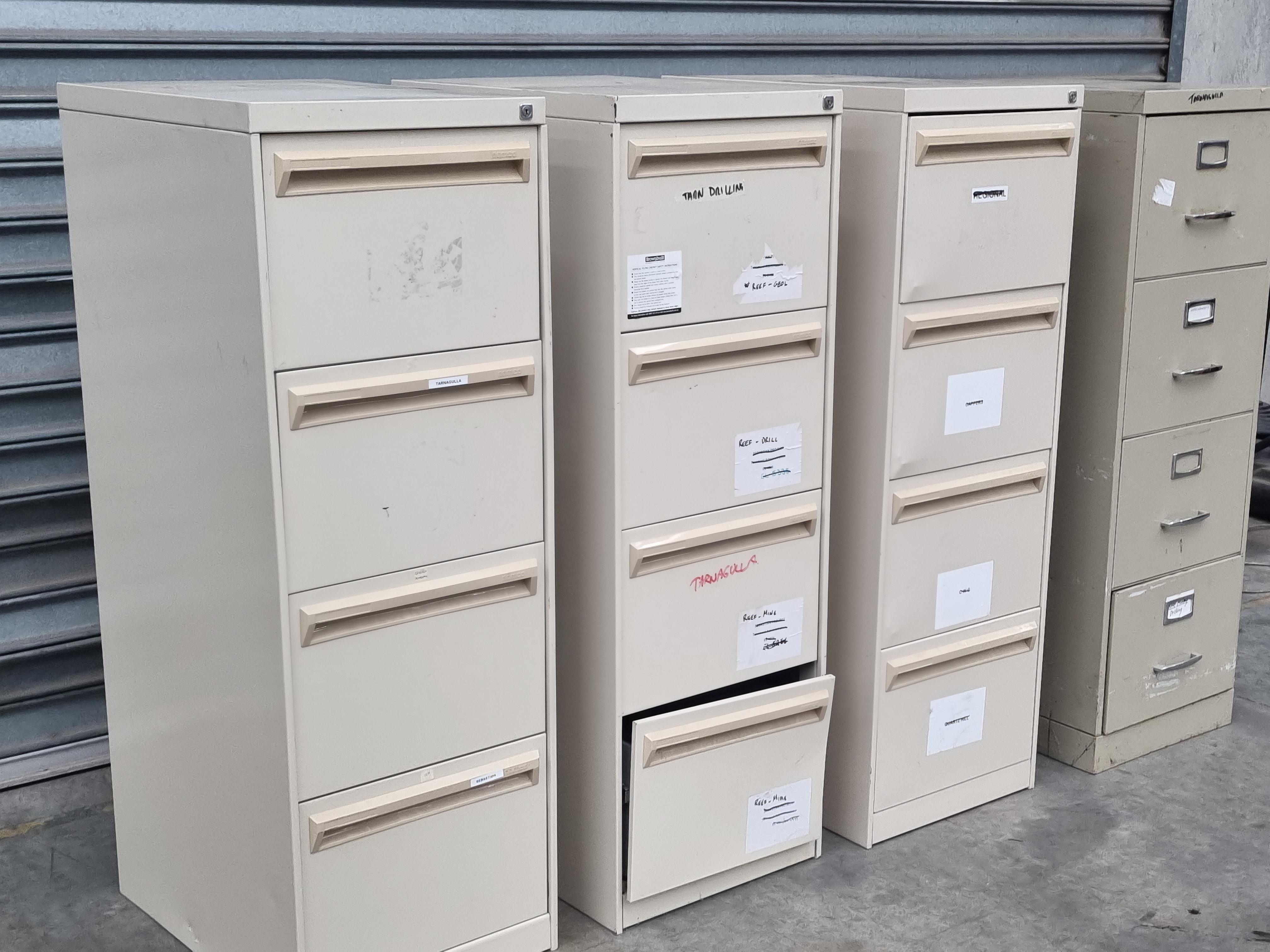 Filing cabinets, metal style, beige finish, 4 drawers, note keys not includedApprox 45cm L x 65cm D x 135cm H,Qty 4,Sold as lot