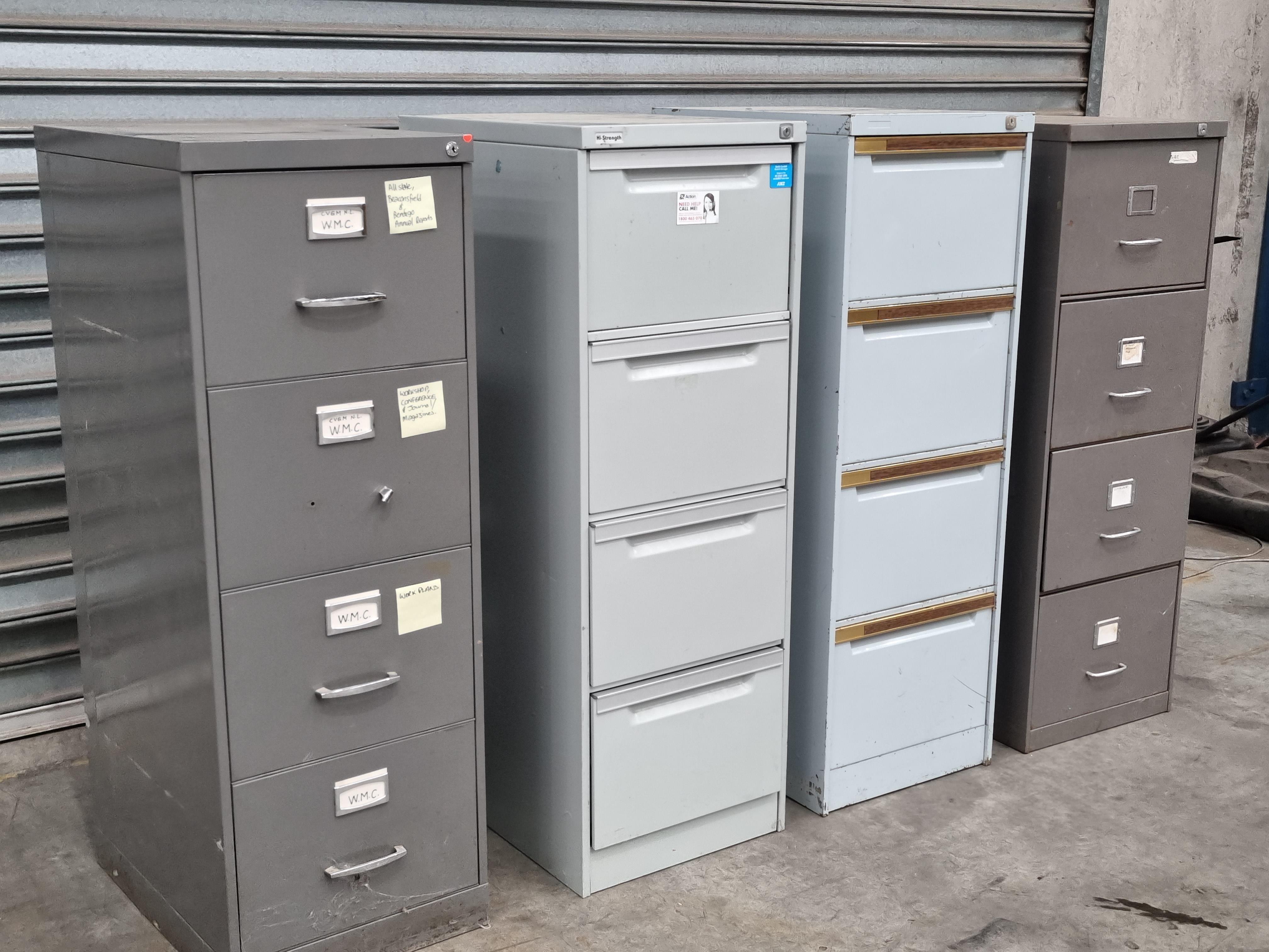 Filing cabinets, metal style, grey finish, 4 drawers, note keys not includedApprox 45cm L x 65cm D x 135cm H,Qty 4,Sold as lot