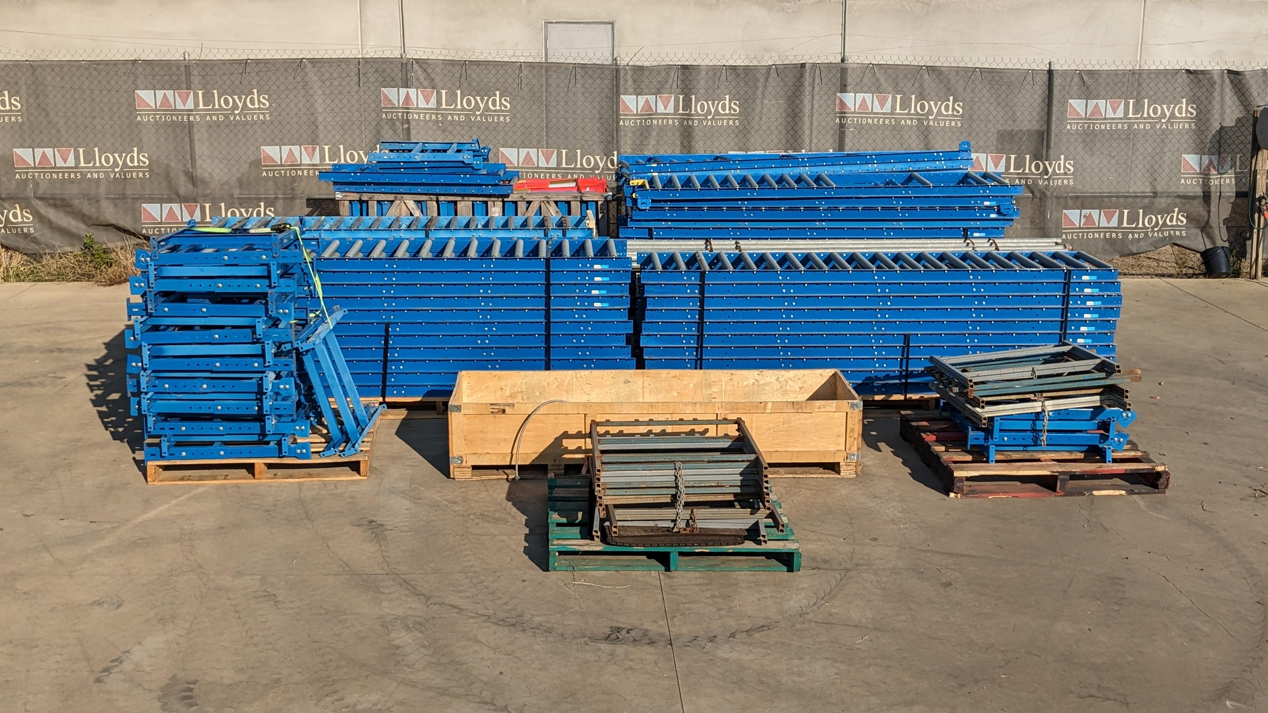 Gravity Conveyor, Dynamics G-EX, Rolling Pins 62cm Width, Lengths at 300cm each, includes spare rolling pins, 10 x A-Frame Supports, 62 x Adjustable Height Feet, 20 Pins per Length, 60 Lengths, 65 Spare Pins in Box, Quantity 60 lengths of conveyors, Sold As Lot