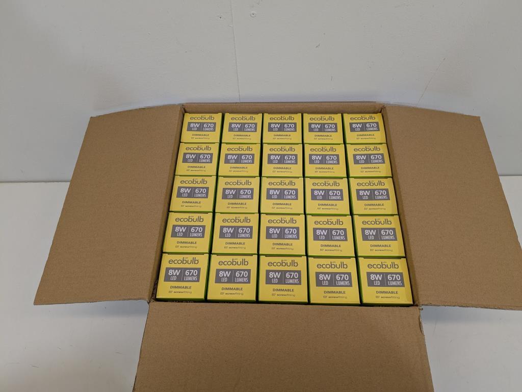 RRP: $495, LED bulbs, Ecobulb, 8w, e27 screw fitting, 3000k 670 Lumens, warm white, 35,000 hours, Qty: 50 bulbs, Sold as lot,