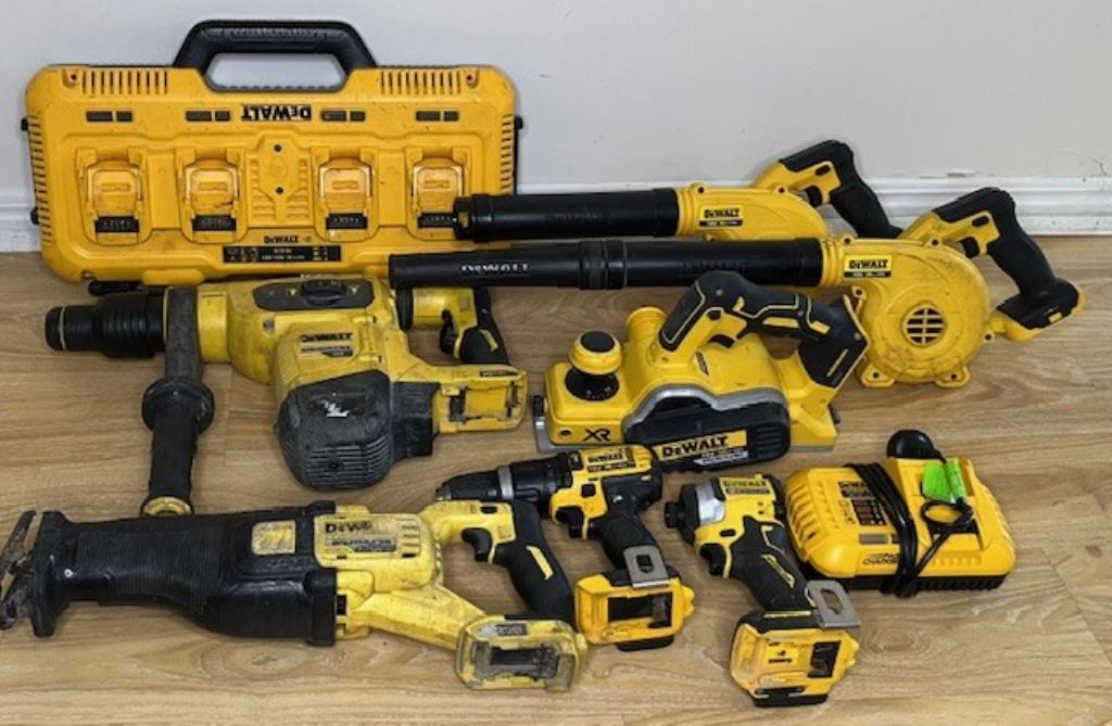 Cordless DeWalt 18V tools. 2 x DCV100-XE mini blowers, 1 x DCH481 rotary hammer drill, 1 x DCF850 impact driver, 1 x DCS383 reciprocating saw, 1 x DCP580-XE planer, 1 x DCD785-XE hammer drill, 1 x DCB118-XE charger, 1 x DCB104 4 port charger. Skins only, no batteries. Condition: Not working, untested, for parts or repair.